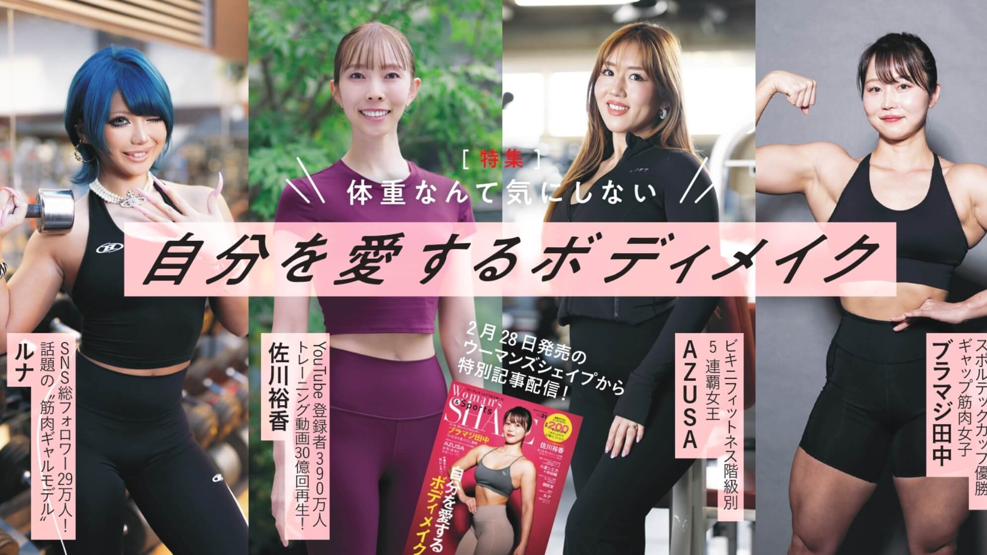 HOME >【特集】自分を愛するボディメイク 【特集】自分を愛するボディメイク ボリュームのある下半身をトレードマークに「ギャップ筋肉女子」として注目を集め、下半身重視の新競技・ウェルネスでのさらなる飛躍が期待されるブラマジ田中が『ウーマンズシェイプ』初登場。ここでは、彼女をはじめ、筋トレを通じて自分を愛せるようになった人々のエピソードを雑誌からWEB版に流用、凝縮した特集だ。自己肯定感を高めるための具体的なアプローチやメソッドについても深く掘り下げている。
