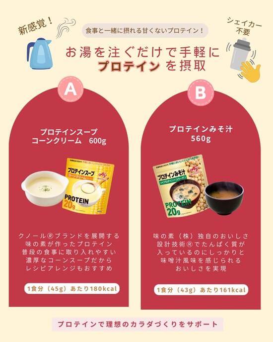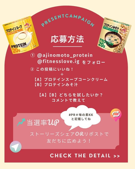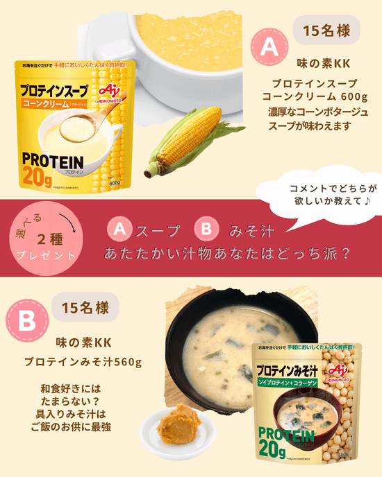身体を冷やさない、食事にも合わせやすいスープタイプ、みそ汁タイプのプロテインを、フォロワー30名様へ抽選でプレゼント。