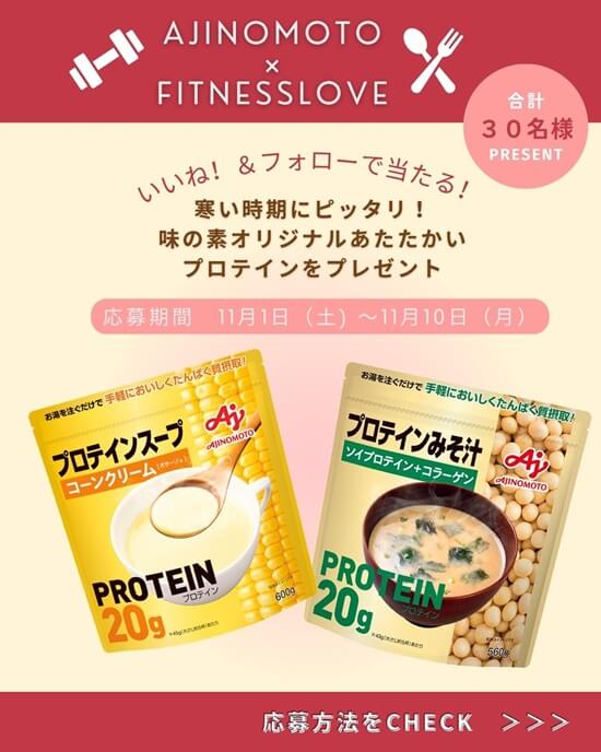 FITNESS LOVE公式インスタグラムが、味の素協賛のプレゼントキャンペーンを実施します。
