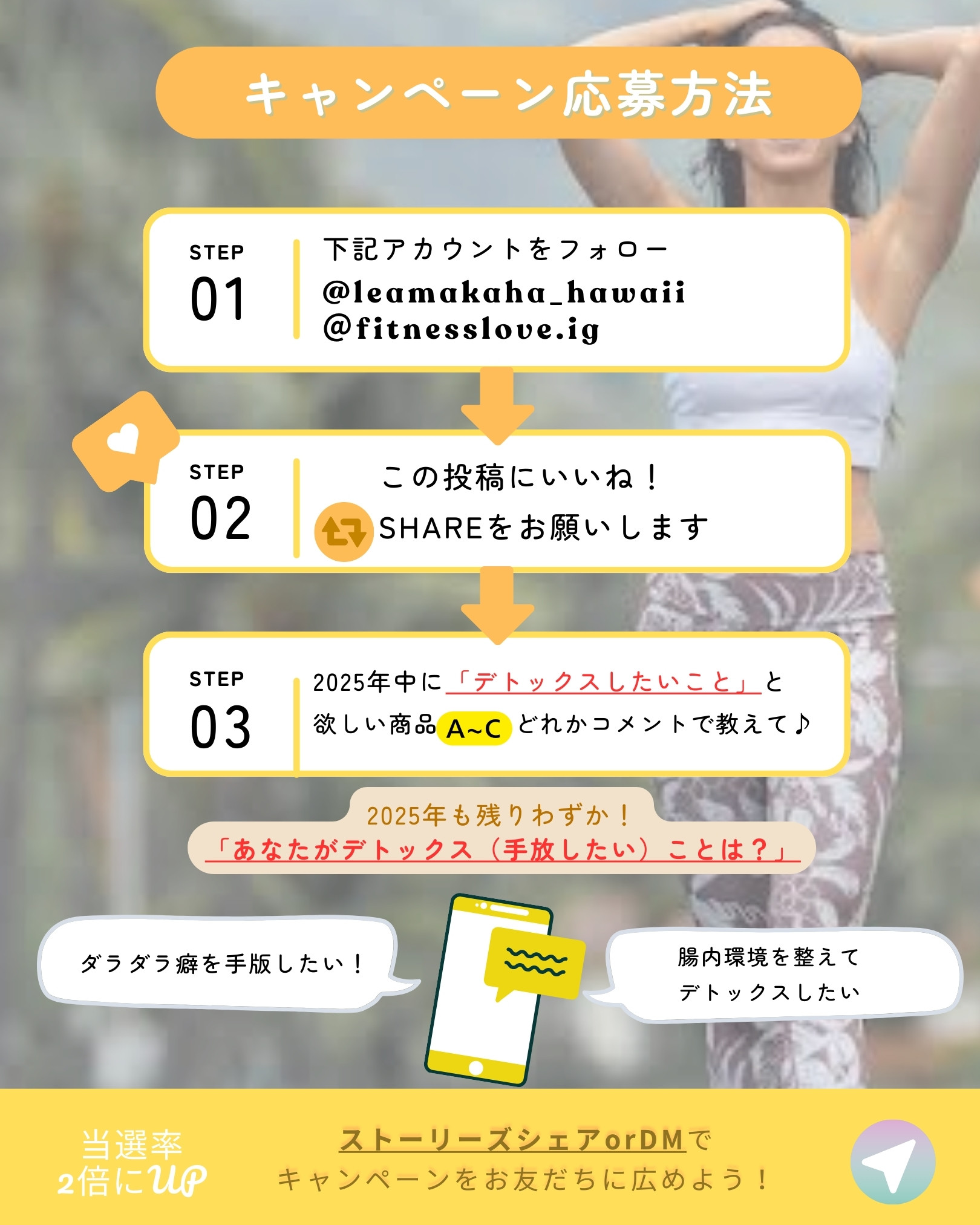 ② @fitnesslove.ig と @leamakaha_hawaii をフォロー&本投稿をシェア