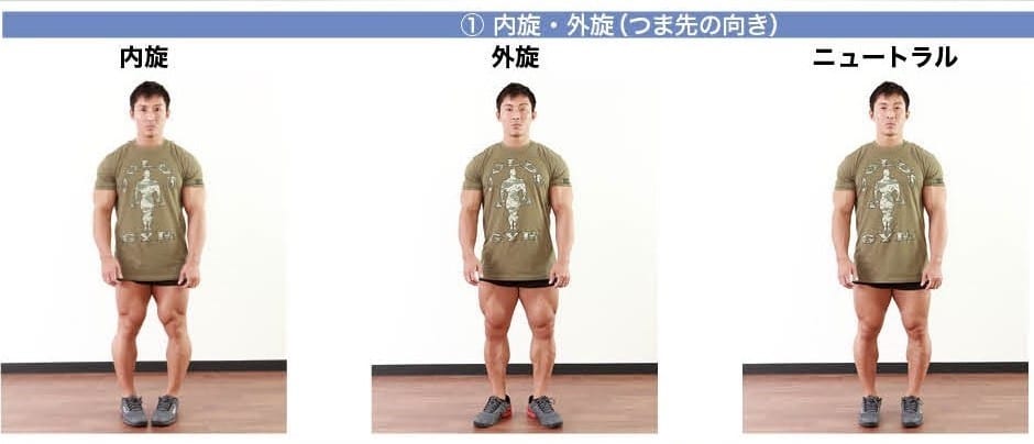 まず「内旋・外旋」。これは大腿骨の向きで、大腿骨が内旋するとつま先は内側に、外旋すると外側に向きます。