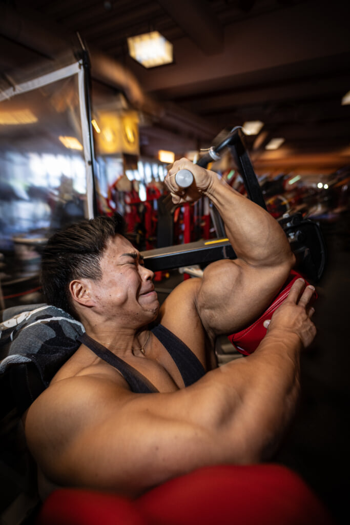 西﨑 もともと、腕の感覚はいい方です。最近は三頭からやって、二頭のトレーニングに移ります。昨年の大会が終わって、腕の日に「二頭から始めるのがイヤやな」って思ったことがあって、三頭から始めてみたんですよ。