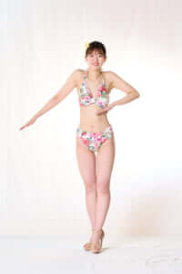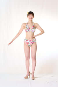 筋量や絞りは「ウーマンズレギンス」と同じくらいで大丈夫。バキバキのセパレーションやカット(筋肉の溝)までは求めていなくて、きれいなアウトラインがあれば十分です。ただ、レギンスと違ってお腹や脚を露出するので、そこがたるまず、しっかり締まっている必要はありますね。年齢的にたるみが気になる方は、水着の幅を広いものにするなど、いろいろ試して工夫してみてください。出すところが多くなる分、トレーニングを少し頑張って。逆にダイエットしすぎると肌がたるんでしまうこともあるので、トレーニング量を少し増やすのがコツかもしれません。