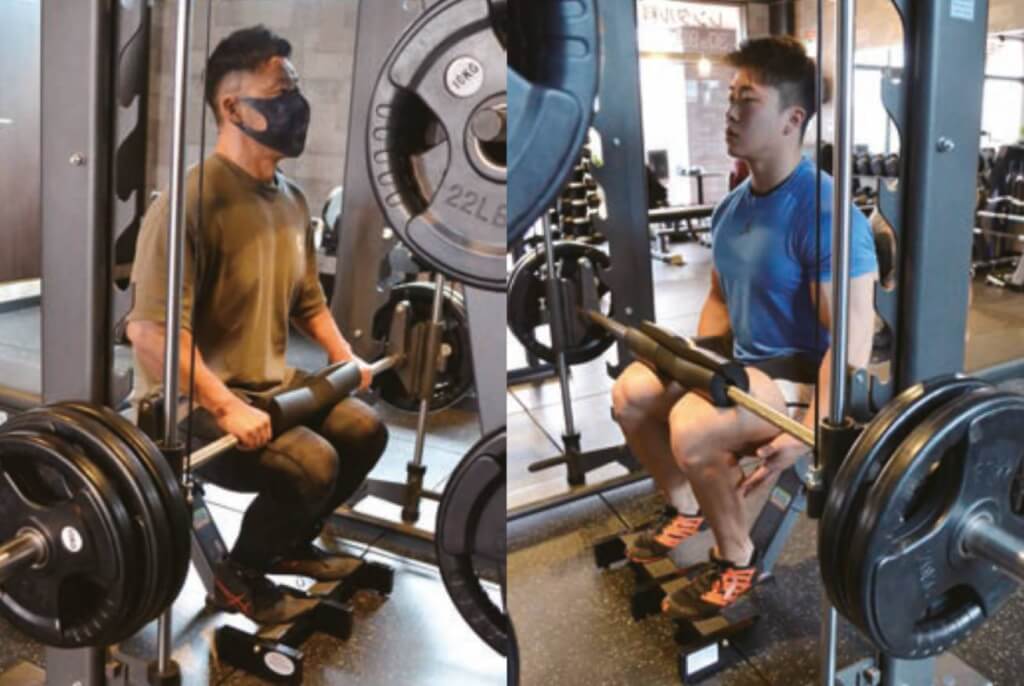 シーテッドカーフレイズで足関節のウォーミングアップを行った後に、大腿四頭筋をターゲットとして、スミスマシンを用いてスクワットを行う。スミスマシンは垂直のものを使用した。バーベルはハイバーで担ぎ、足幅は腰幅程度、つま先は軽く外に向けて行う。担いだ時、バーの真下に股関節がくる位置から若干後ろ側に足を置く。これにより重心が少しだけ前方にずれ、それにより膝が動きやすくなり、膝関節伸展させる大腿四頭筋に対して強い刺激を入れることができる。