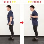 足の幅は腰幅程度。重心は足裏全体にかかるようにし、かかとに寄らないようにする。肩を少し落とした状態にし、肩を安定させる。その状態でダンベルを保持して肘を曲げていく。挙げたときは小指側が少し上になるように。動作中、肩は安定させたまま。後ろに引いたり、上げたりしないようにする。肘が自然に上がっていくのはOK。
