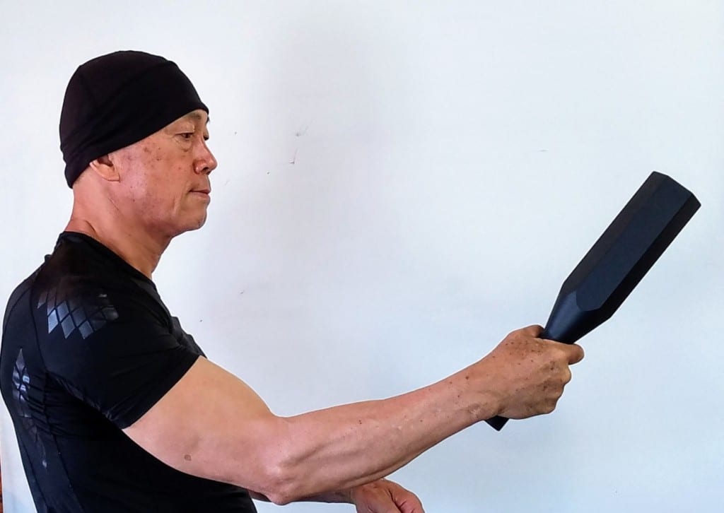 前方 両足を前に出せば大殿筋に効いて、お尻の筋肉の引き締めに効果が出る。