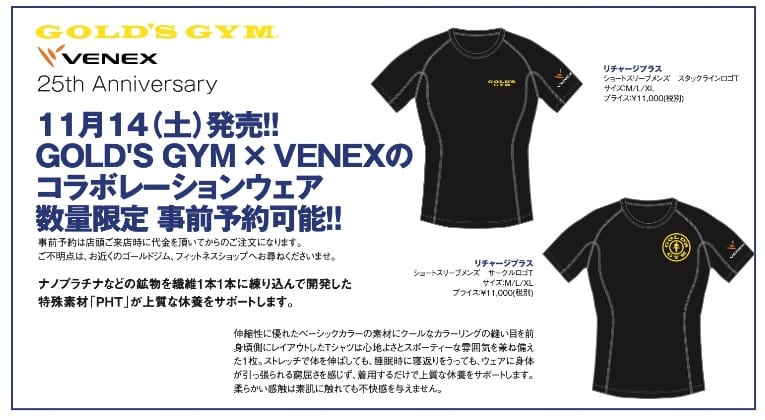 このGOLD'S GYM×VENEXのコラボレーションウェアは10月31日開催のマッスルゲート神戸大会のブースにて先行販売する。