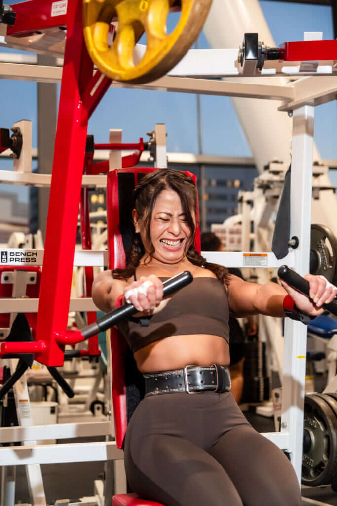 変化が出始めた頃、藤原選手はゴールドジムでパーソナルトレーニングを受けているお客さんに目を留めた。誰かの指導を受けている姿を見て、「追い込んでもらうの羨ましい」と思ったという。「私、だるだるなんですよ。本当に。自分で厳しく追い込めないんです」