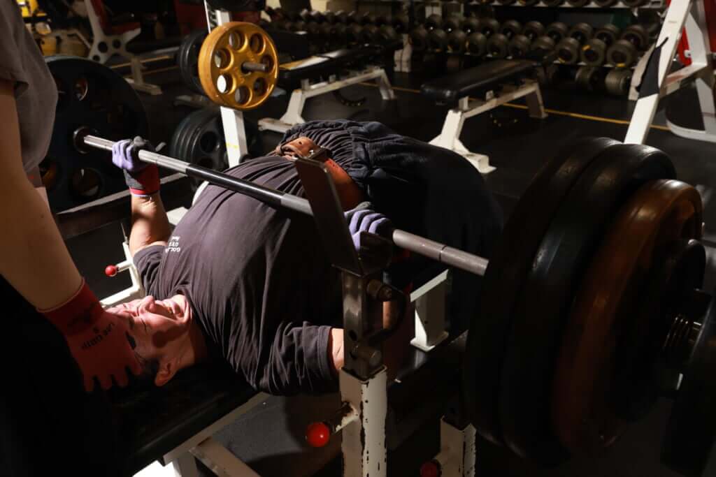 2024年東京選手権前の胸トレ時。セットの組み方は自力で1レップ+補助で2~3レップ。すぐさま20㎏落とし自力で限界まで+補助