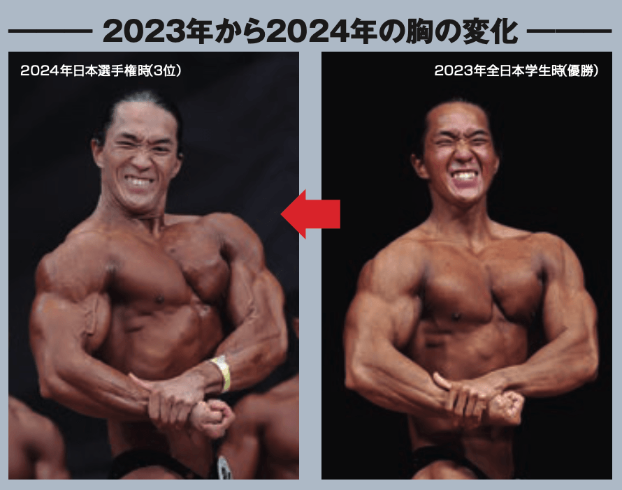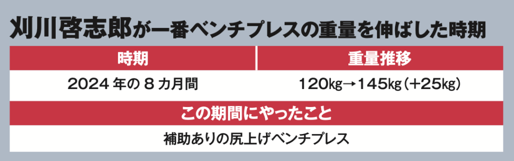 ベンチプレスが最も伸びたと感じるのは2年前の2024年シーズンですね。元々は120㎏でセットを組んでいたのが、約8カ月で、140㎏から145㎏でセットを組めるまで成長しました。