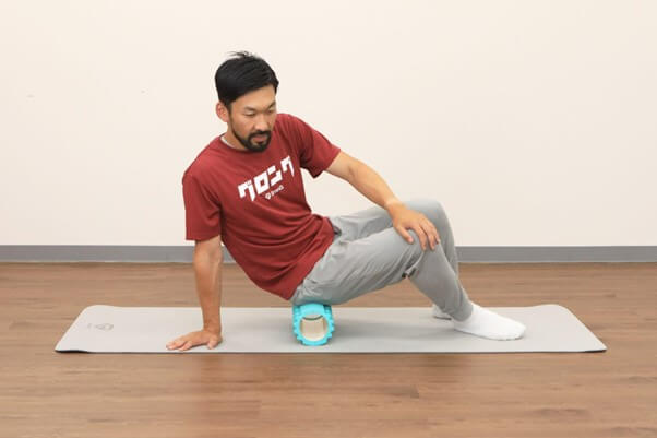 1.両膝を曲げて手で身体を支えながら、片側のおしりの中央にローラーを置く。