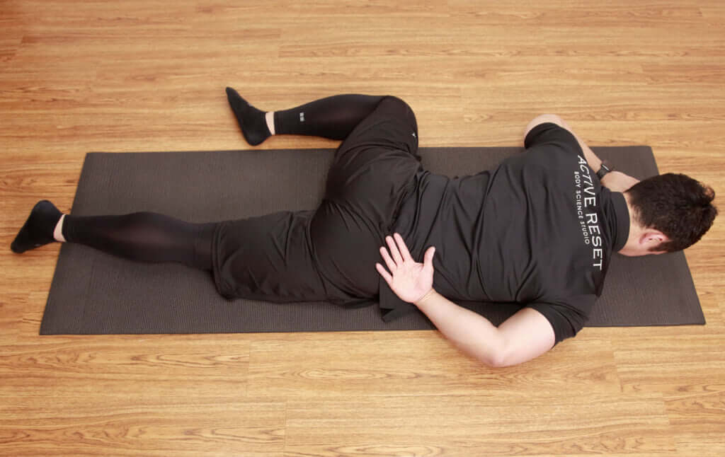 ①小胸筋のところにボールを置いて、グッーと体重をかけて動かしていきます。うつ伏せになるだけで圧をかけられているので刺激は入っています。圧のかかっていないほうの脚を曲げてあげることで、上体が圧のかかっていない方に回旋し、より小胸筋に圧をかけやすい状況を作ることができます。