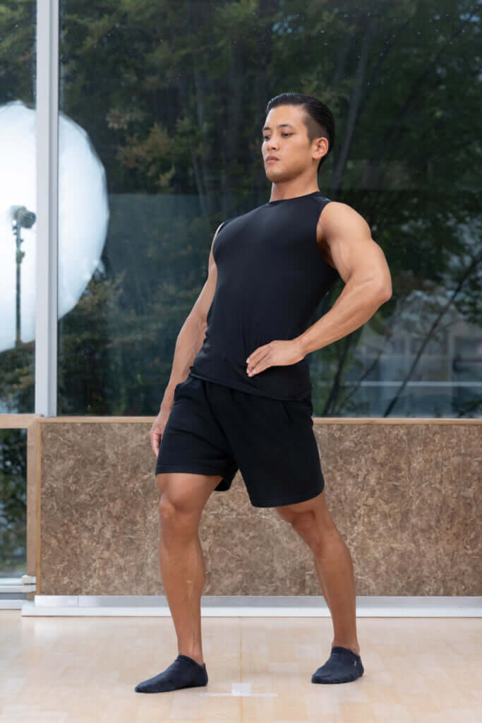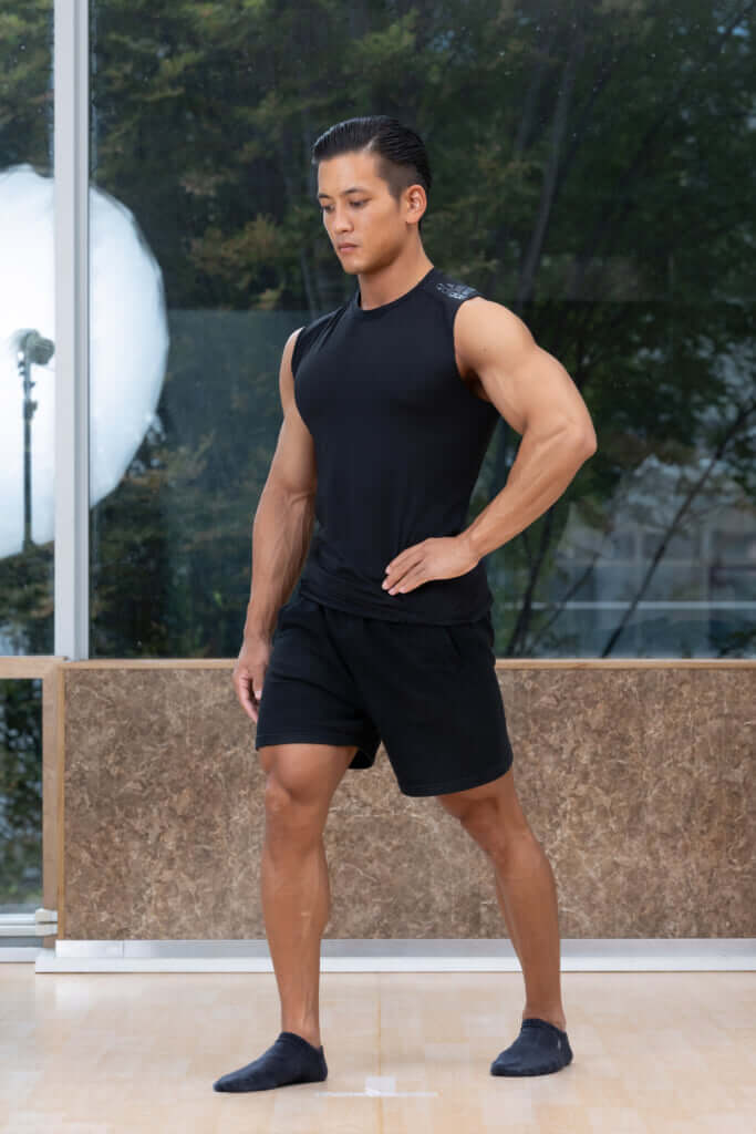 その状態のまま、つま先を内と外に動かす