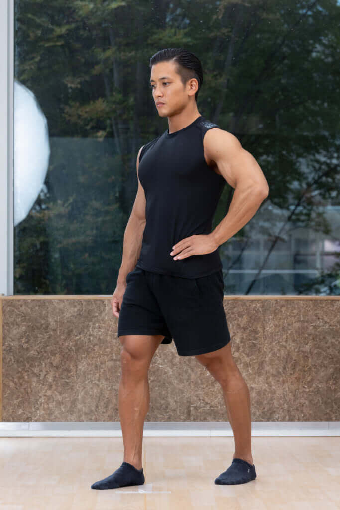 このとき、かかとは床につけるようにする一方の手で腰を押さえる