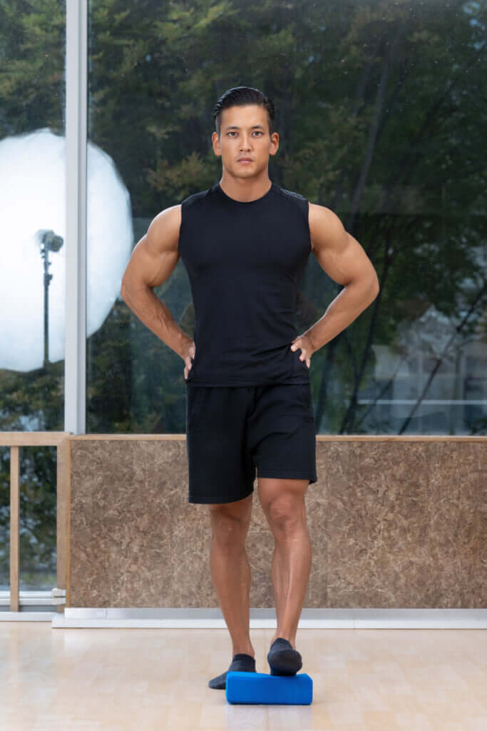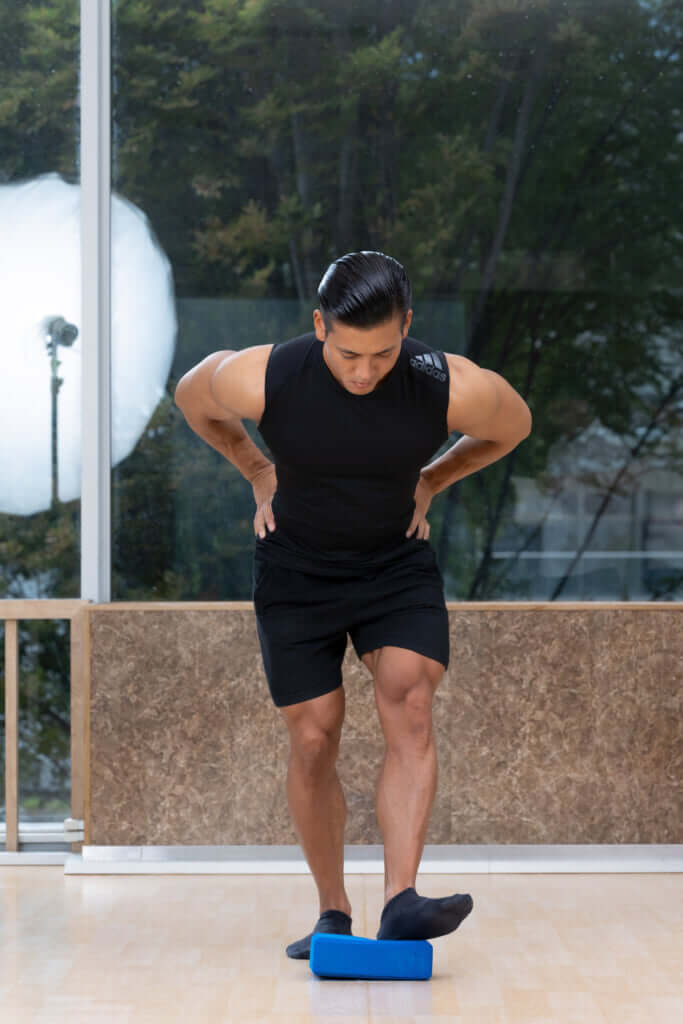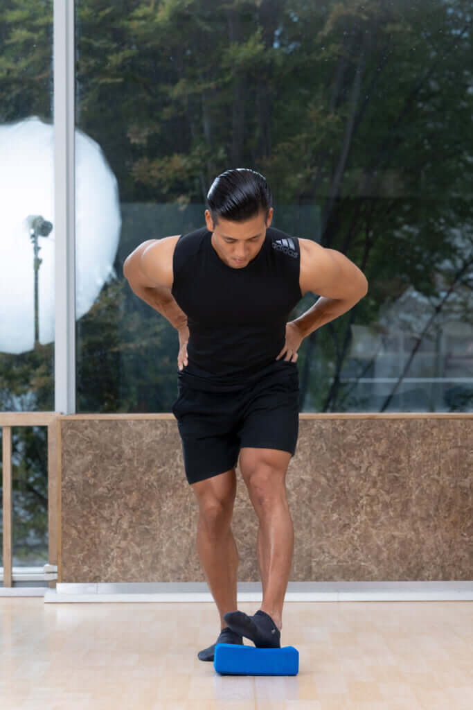 足を前に出してブロックにかかとを乗せる