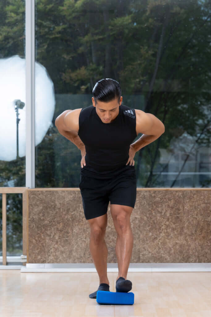 腰へのアプローチ(かかとをブロックに乗せる)