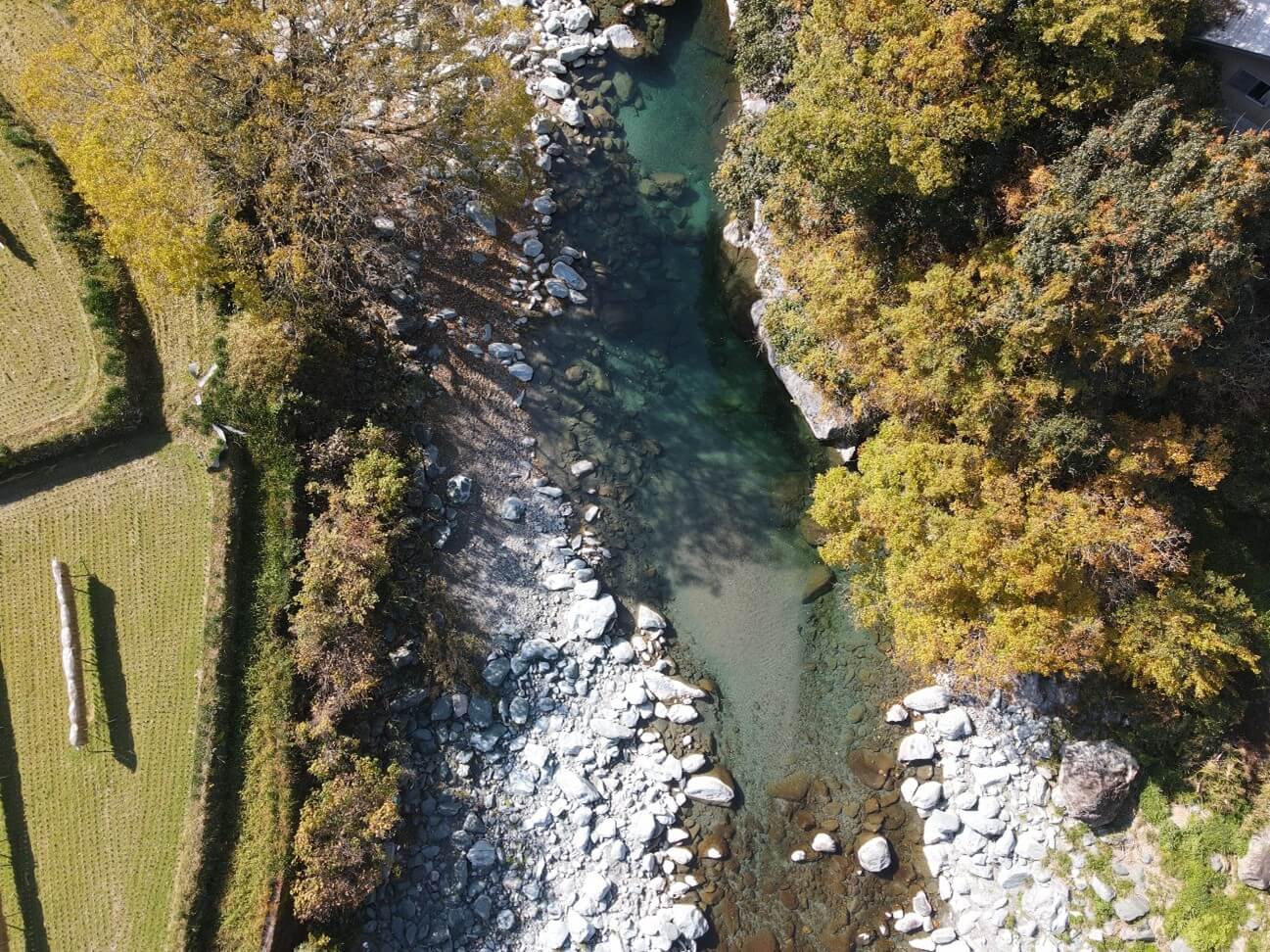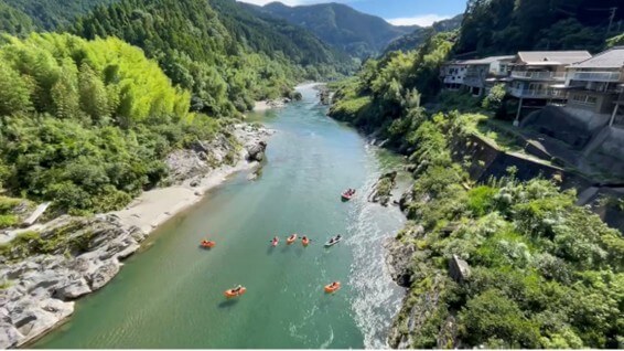 山に囲まれた大豊町では、トレーニングの後に川へ入ったり、バーベキューや焚き火を楽しんだりすることもできる。また大豊町を流れる吉野川のラフティングは、激流で知られる日本有数のスポットでもある。地域の子どもたちが飛び込んで遊ぶ小川には、ジム施設から新たに階段も整備した。