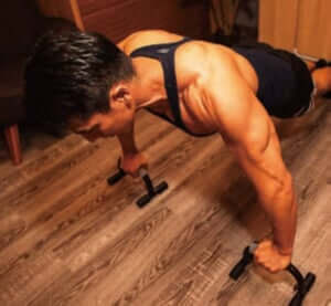 実際にジムへ行った時のため、ハンドルをバーべルと同じ向きにしたバリエーションです。「腕立て伏せをしてください」といわれてこの向きにハンドルを置く人は稀だと思いますが「自重べンチを挙げる」という目標に向かって取り組んでいるので、イメージトレー二ングとしても良いのではないでしょうか。