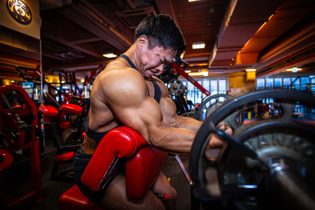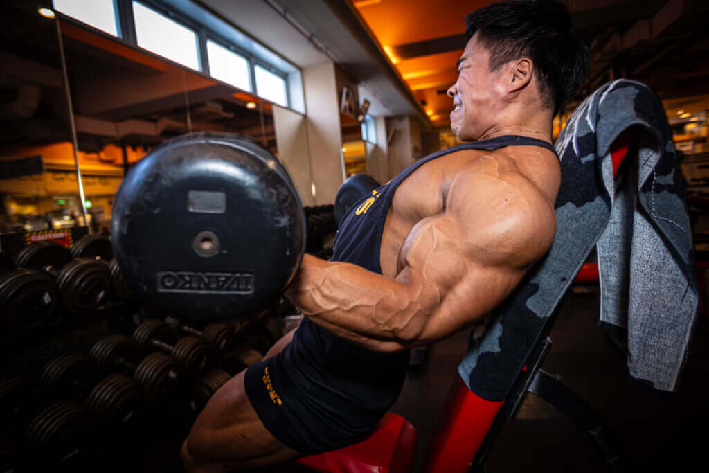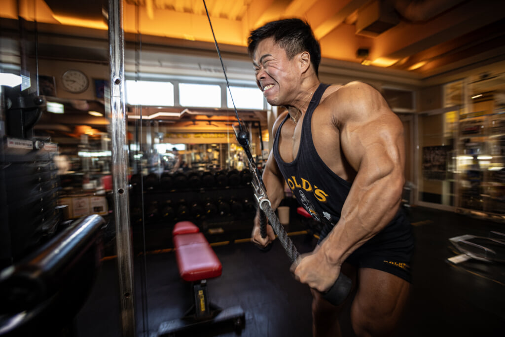 二頭も三頭も、まずはケーブル種目を1セットあたり20レップほどで行っていた。これにより、トレーニングに対する感覚を良くすることを狙っていた。メイン種目の回数は8レップから12レップほど。