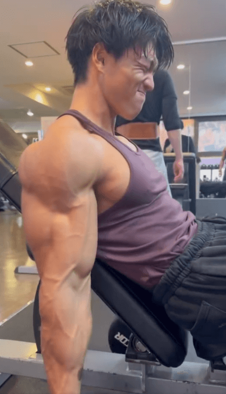 「2025年のインクラインダンベルカール中です。今は腕周り47㎝なので、50㎝を一つの目標としています」