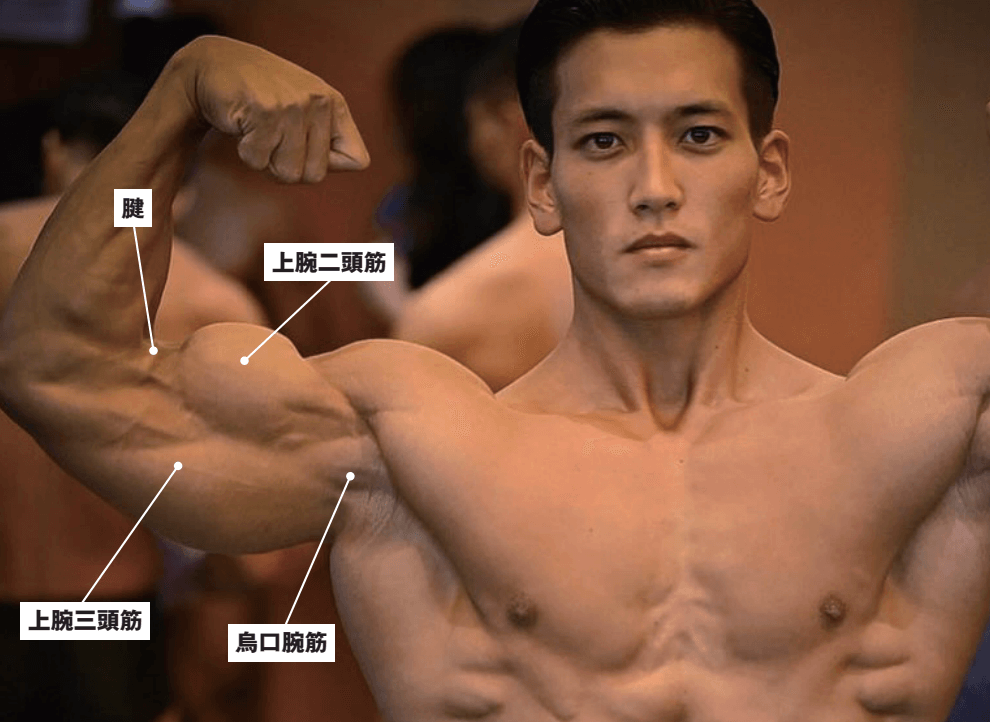 見栄えのする腕をつくっていくためには、腱について考えることも必要です。腕を曲げたときに二頭筋腱がくっきり見えると、ステージ上でより太く立体的に見えるようになります。二頭筋・三頭筋・烏口腕筋(うこうわんきん)・腱の4つの部位をバランス良く主張させると、実際の太さよりも良く見えてきます。
