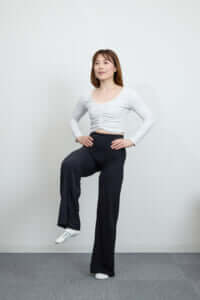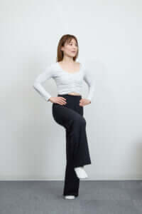 ①腰に軽く手を添え、骨盤底筋を引き上げて片足立ちになる。