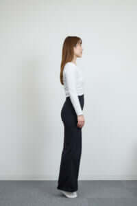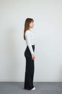 ①骨盤をニュートラルにして両脚を揃えて立ち、骨盤底筋を締める。