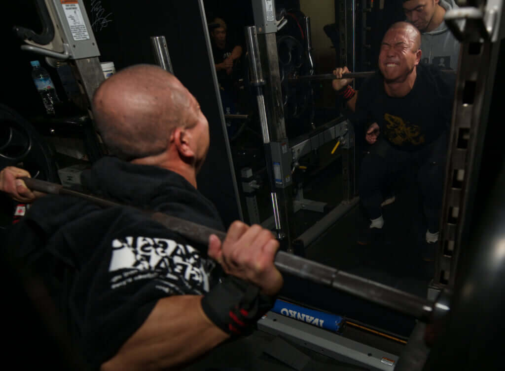メニューの組み方は、180㎏で2セット、200㎏で2セットというように20㎏刻みで重量を上げていもその姿勢に合わせて立ち上がるだけです。フィジークをやっていた頃はこの考えはなかったのですが、その後「どうやったら挙がるんだろう?」と考えているうちにたどり着きました。スクワットでどこかの部位を狙おうとするのではなく、ただ重いものを担ごうとするのが今のスタイルです。それ以外で意識しているのは、ハムストリングと殿部でウエイトを支えることです。自分の場合は、スクワットで大腿四頭筋を狙おうと考えくやり方でした。全体で4セット行うやり方は、このときから今までずっと変わっていません。最初の重量では8〜10レップ、次の重量では3〜5レップ狙いというのが、自分の中の一つのスタイルです。