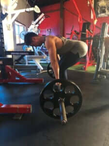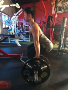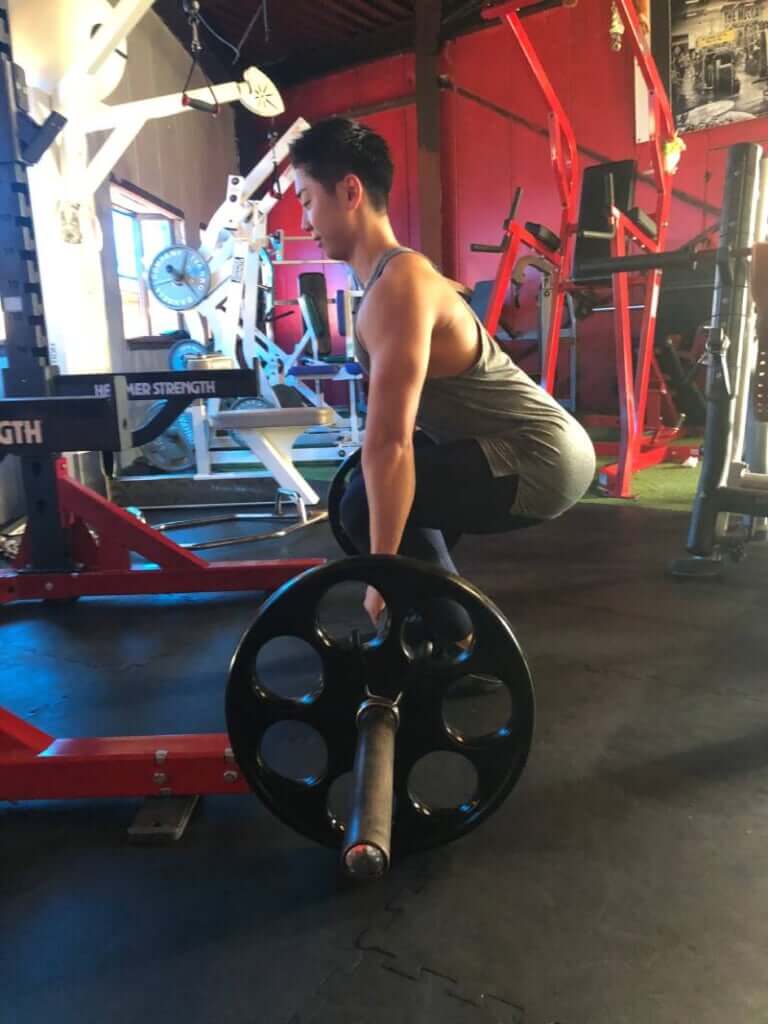 身体を立てた状態がスタート姿勢です。スクワットのボトムポジションに近いので、このエクササイズはスクワットと同様、デッドリフトに比べて大腿四頭筋の動員が多くなると言えます。また、脊柱に対しては長軸上の圧力がかかるので、脊柱への負担は大きくなります。