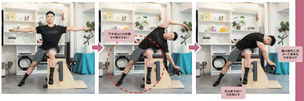 ③左方向に上体をゆっくりと倒し、右半身の側面にストレッチがかかることを感じる