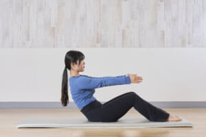 ①両ひざを曲げ、骨盤を立てた状態でマットに座り、両手を前に伸ばして大きく息を吸う。