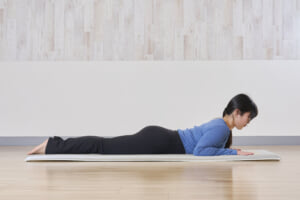 ②息を吸いながら、鼻先をマットにこするようなイメージ、また鎖骨を前方に見せるようなイメージで上体を上げていく。写真の姿勢を取ったら、息は吐きながらゆっくり元の姿勢に戻る。