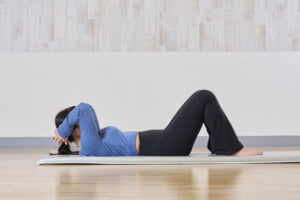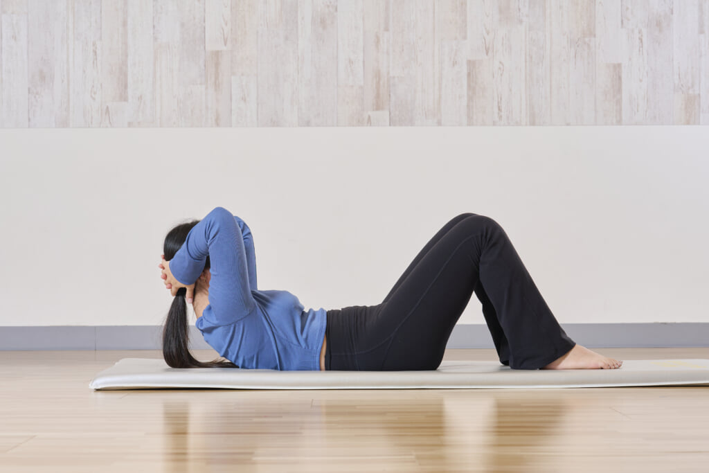 ①マットにあお向けになり両ひざを立て、両手を後頭部に添える。