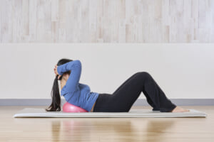 胸のあたりにボールを置いて、ボールを前に転がすようにして上体を起こすと、胸椎伸展の感覚がつかみやすくなります。