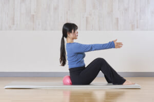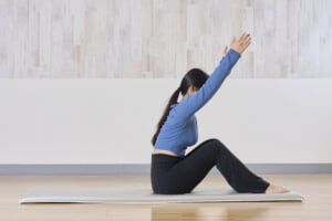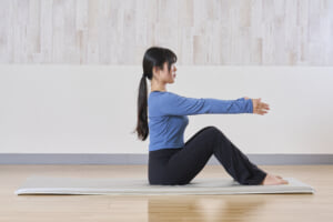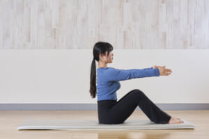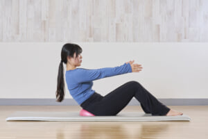 ①両ひざを曲げ、骨盤を立てた状態でマットに座り、両手を前に伸ばして大きく息を吸う。