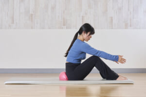 ボールを仙骨下部に当てると、骨盤を起こすサポートになります。