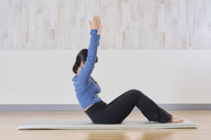 上体を起こすときは胸の中心(みぞおち付近)と恥骨は床につけておき、お腹はマットから手の平1枚分くらい浮かせておくイメージで!