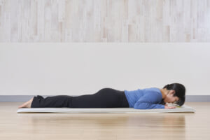 ①両脚を軽く開いてうつ伏せになり、両手はマット幅に。恥骨をマットに押し込むようにして骨盤をニュートラルにする。