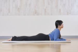 ②息を吸いながら、鼻先をマットにこするようなイメージ、また鎖骨を前方に見せるようなイメージで上体を上げていく。写真の姿勢を取ったら、息は吐きながらゆっくり元の姿勢に戻る。