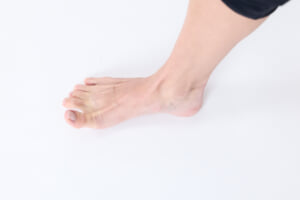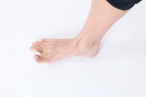 立位の姿勢で、片方の足の付け根のMP関節、指を写真の方向に曲げる。足指で物をつかむ・握るイメージを持ちながら。
