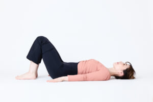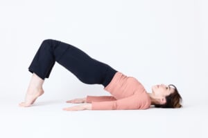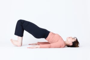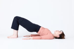 ①あお向けになり両膝を立てたら、お尻と腿裏を使い胸から膝までを一直線にキープ。