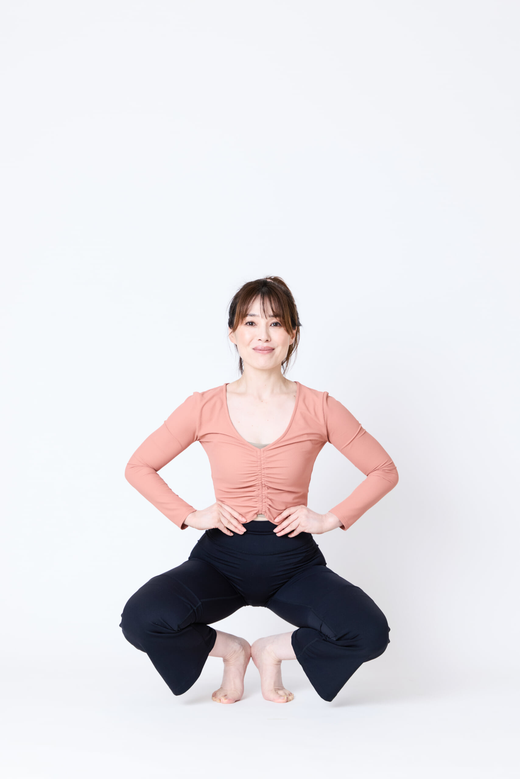 しゃがんだときに前傾しすぎたり、かかとにドンとお尻を乗せすぎるのはNG。常にまっすぐ上に伸びる意識を持つこと。スクワット前のウォームアップや全身運動としてもオススメです。