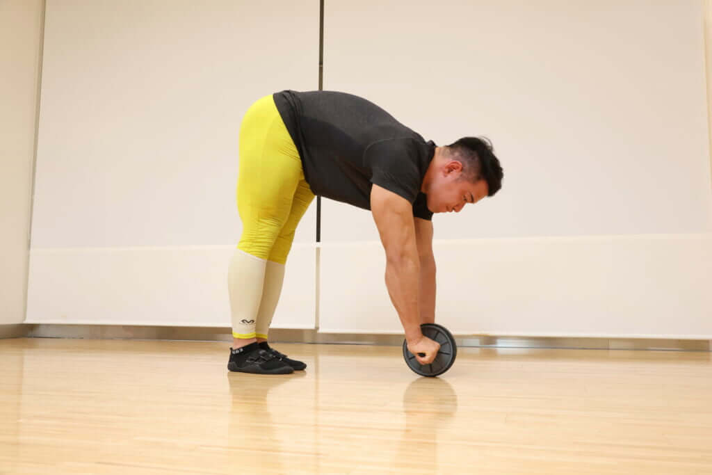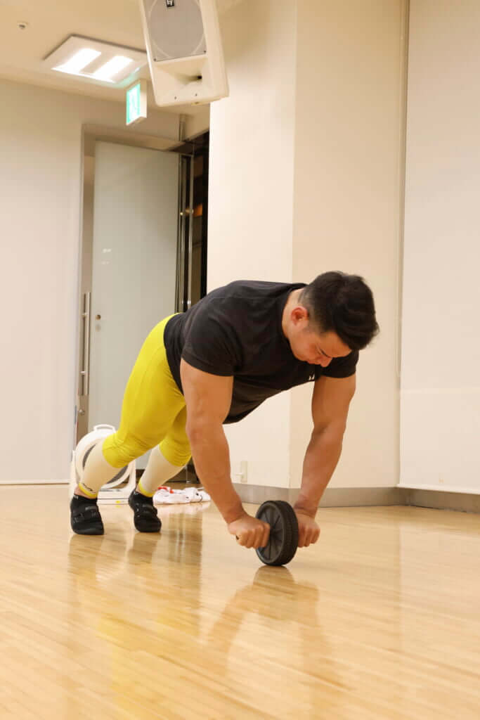 ○身体を前傾させ、立ち姿勢からアブローラーを前後に大きく動かす