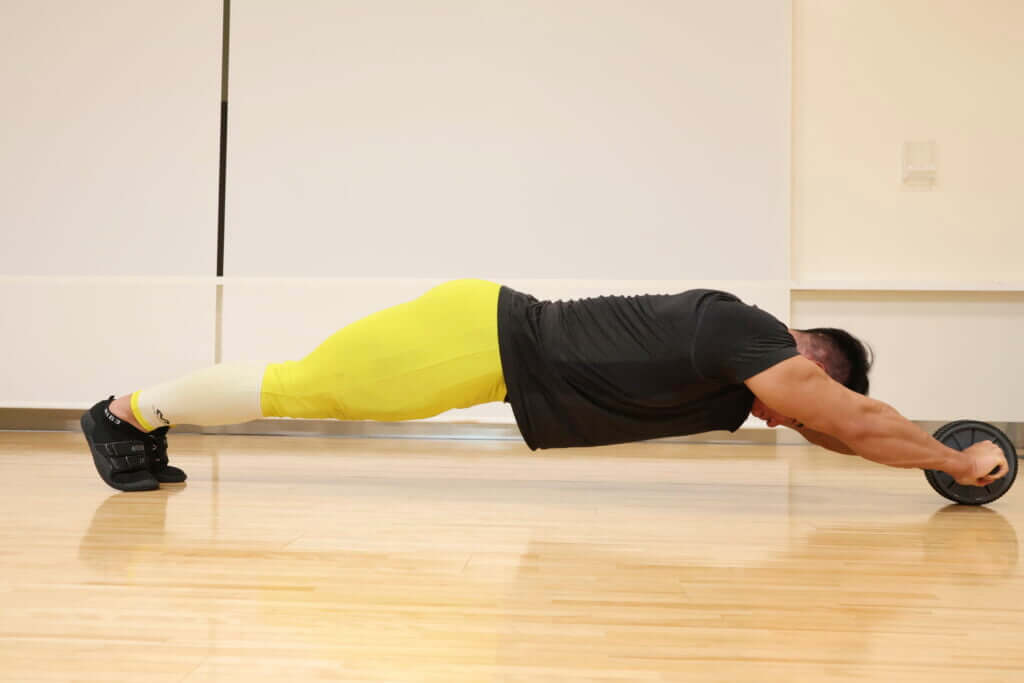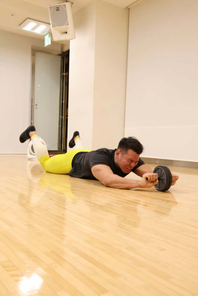 ○身体を前傾させ、立ち姿勢から床に腹部を突撃させるイメージでアブローラーを前方へ転がす
