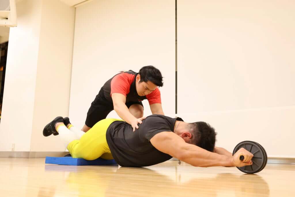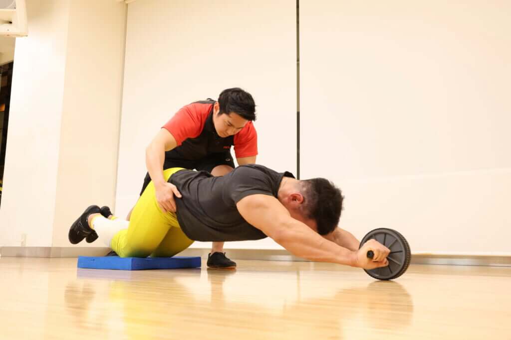 ○立ち膝の状態から、アブローラーを前に転がすタイミングで補助者に負荷をかけてもらう