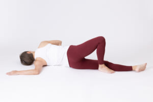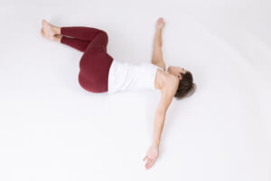 右体側を下にして横になり、脚を揃えて膝を90度に曲げる。息を吸いながら左腕を持ち上げ、背中側の床に向かって下ろしていく。膝がずれないよう注意しながら、肩甲骨の内側が床につくように意識をして胸を開く。5~10呼吸キープし、反対側も同様に行う。