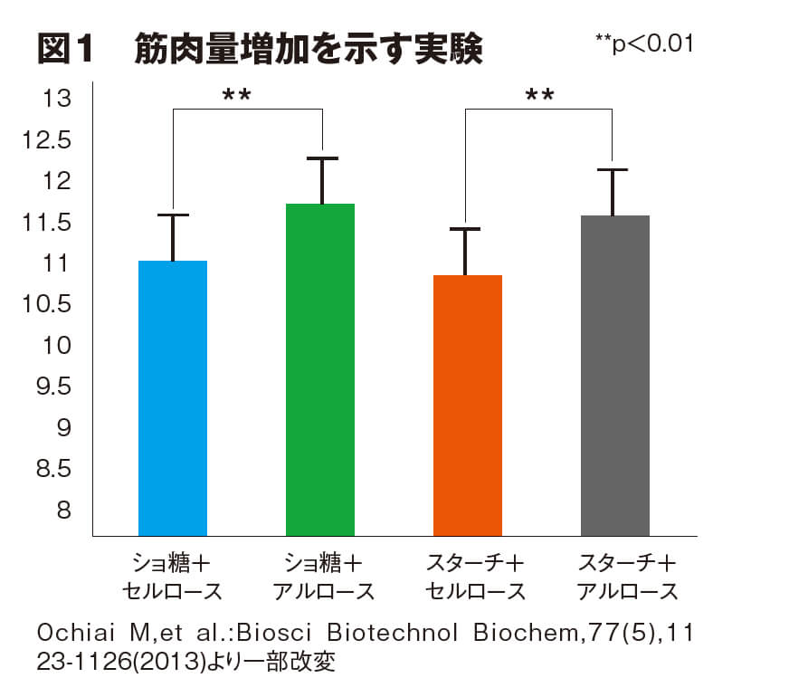 Wistar系雄性ラットに7週間高ショ糖食を摂取させ成熟期まで飼育後、4群に群分けした。それぞれの群には、5%セルロース含有高ショ糖食、5%アルロース含有高ショ糖食、5%セルロース含有高スターチ食、5%アルロース含有高スターチ食を8週間摂取させた。摂取終了、筋肉の重量を測定。その結果、いずれの飼料においてもアルロース摂取により筋肉量の増加が認められた。このことからアルロース摂取は筋肉量の増加をもたらし、身体作りにも有用であると言える