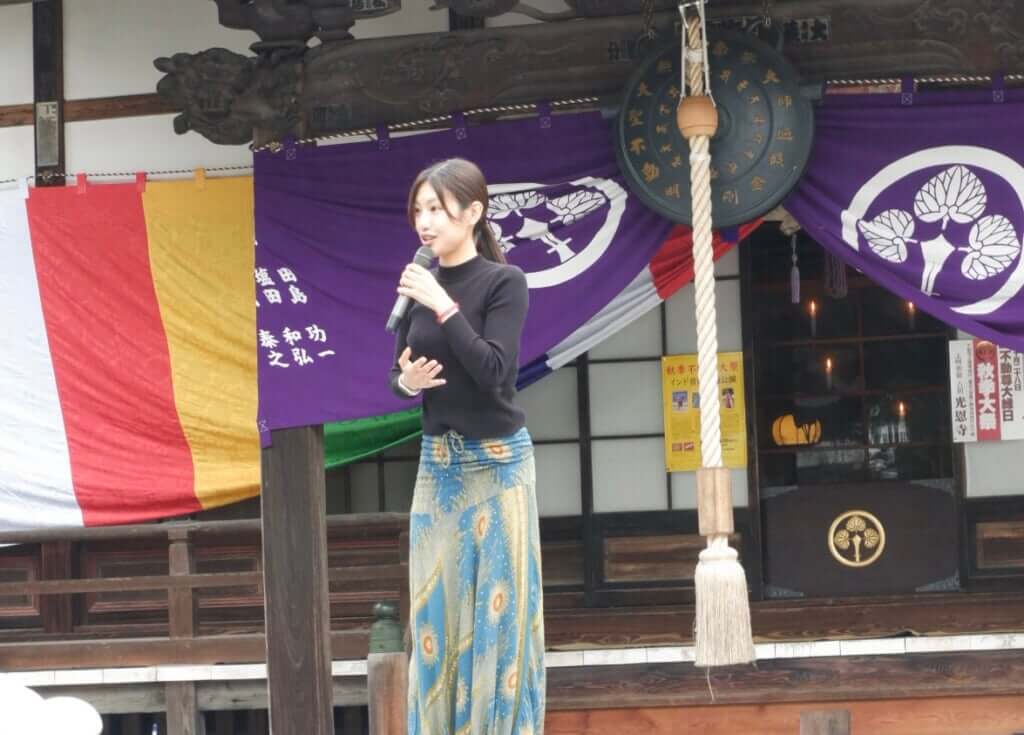 今回の会場となった赤岩山・光恩寺(こうおんじ)は、約1400年前の推古天皇の時代に開かれたと伝わる、北関東の古刹。鎌倉時代には後醍醐天皇に庇護され、修行僧の育成にも力を注ぎ、現在の住職で第84代を数えるという、長い歴史を受け継ぐ寺院だ。現住職はサンスクリット語の専門家でもあり、インド大使館との交流を通して20年以上にわたり寺でインド舞踊公演を開催してきたという。こうした中、インド文化が地域に根づき、舞踊や音楽がこの町の名物となった。