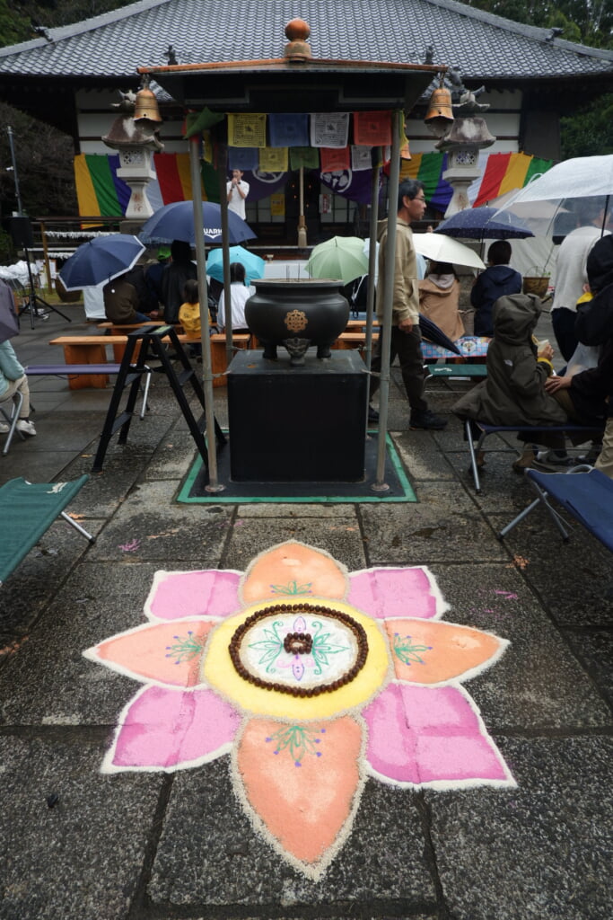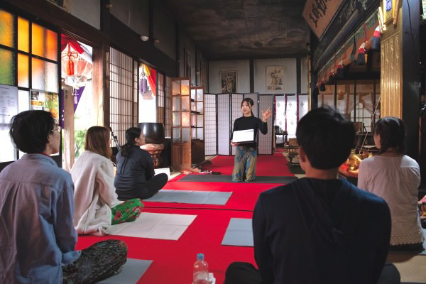 Honokaさんの声に導かれ、「AUM(オウム)」のマントラが静かに本堂に響いた。5000年以上も前から伝わる「A・U・M」という3つの音は、宇宙の始まり、維持、終わり、すべての循環を表す。その響きは身体の奥深く、細胞の一つひとつに届くように広がっていった。